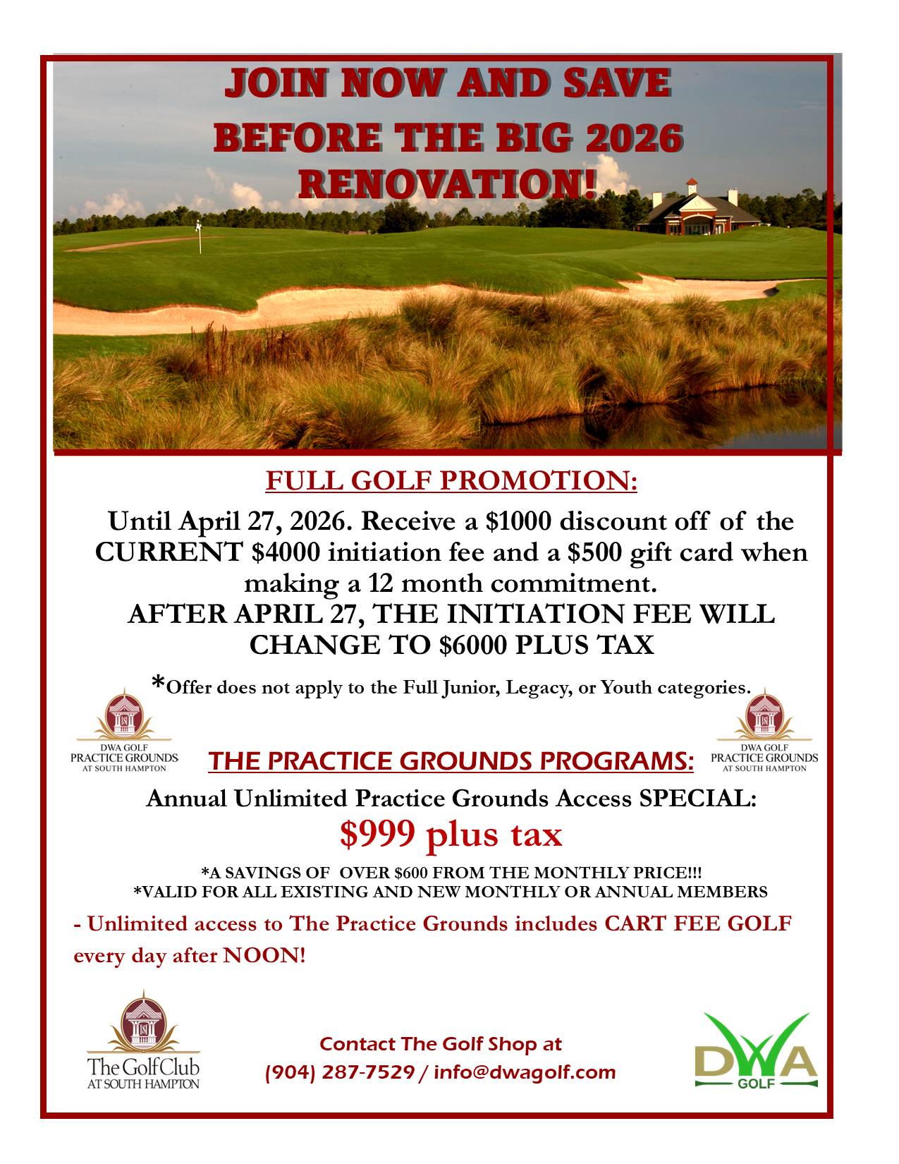 The family owned and operated experience that awaits you on one of Northeast Florida’s most player friendly, signature Mark McCumber designed golf courses is surely going to fulfill your recreational enjoyment of the game. Book your tee time online and begin playing the game as it should be today!